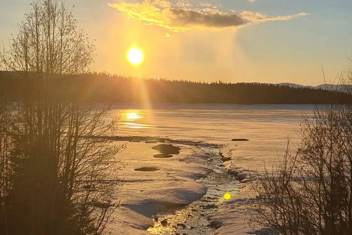 Sjöarna börjar se luriga ut med alla bäckfåror och älvutlopp som brutit upp och utgör potentiellt farliga situationer. Åk inte ut på en is om du inte vet status på den.